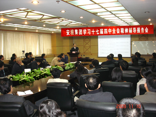 二〇〇九年十一月十日下午,安糧集團舉行專題輔導報告會,集中學習黨的十七屆四中全會精神,部署貫徹落實全會精神的有關工作,并邀請了省委黨校汪興福教授來公司作《學習十七屆四中全會精神》和《國有企業領導人員廉潔從業若干規定》的專題輔導報告。黨委書記金東主持報告會,安糧集團本部中層以上干部、集團各控股子公司部門正職以上干部、集團各黨支部全體在職黨員(老干部支委)以及合肥建工集團黨政領導班子成員參加了報告會。