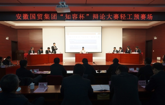 12月23日下午,由國貿集團團委主辦的“知容杯”辯論大賽在輕工賽區火熱開賽。本次大賽由安糧、技術、輕工、服裝、安徽進出口、華安、工藝7家單位組隊參加比賽,其中我司派出2支代表隊參賽,安糧一隊由新能源劉毅、安糧國際彭震、安糧期貨高軍偉、安糧實業馮婷梅組成,安糧二隊隊員為合肥建工許亞鋒、龐濤、許諾、朱潤,安糧集團總經理助理周洪擔任比賽評委。