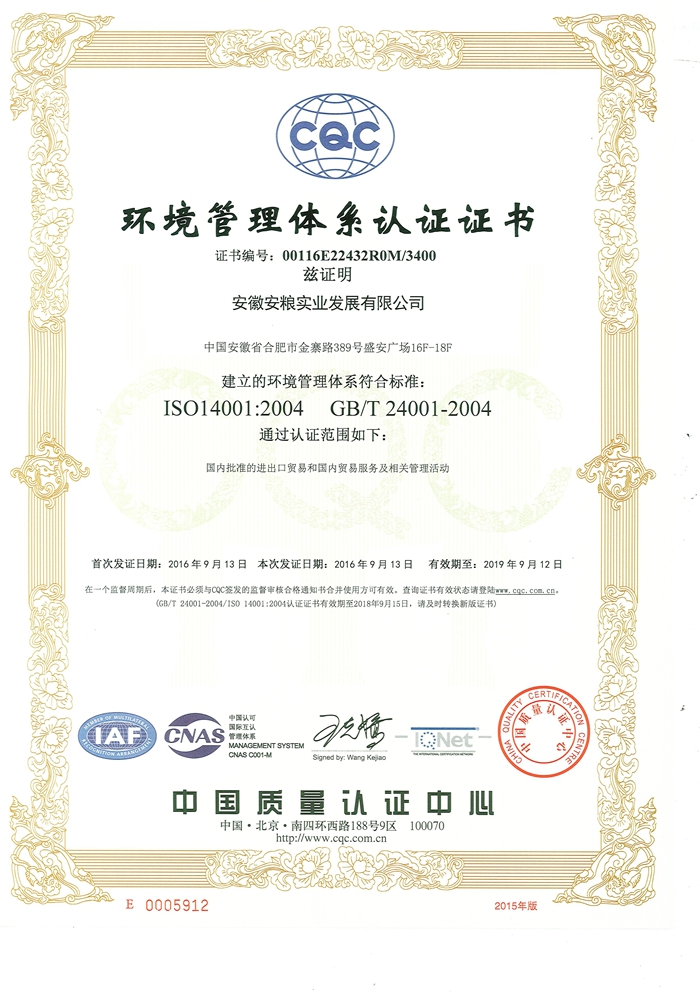 近期,安糧實業順利通過中國質量認證中心審核,在ISO9001認證的基礎上又取得了ISO14001環境管理體系和OHSAS18001職業健康安全管理體系認證證書。證書的獲得標志著安糧實業建立了完整國際化管理體系,實現了ISO9001、ISO14001和OHSAS18001三個體系并行運轉,必將促進公司生產經營活動更上一個臺階。
