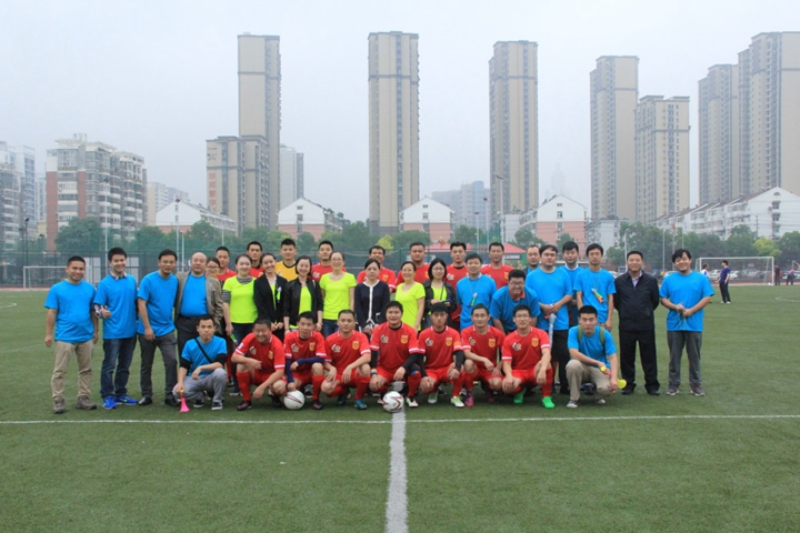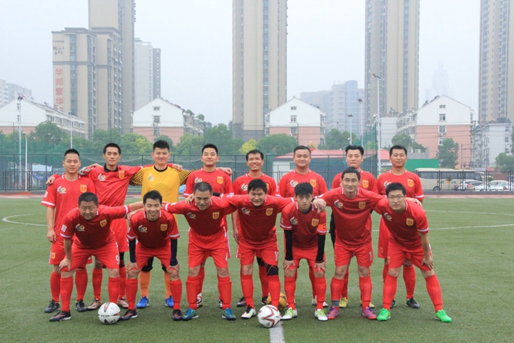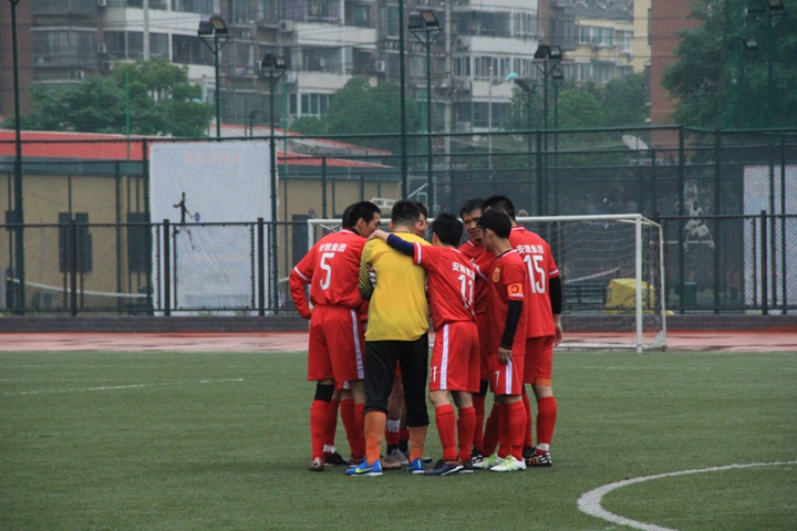 比賽開場不久,惡劣的天氣和球員的狀態不佳就讓我方遭到了懲罰,對方遠射,門將李釗不敢怠慢,奮力撲出第一點,無奈對方前鋒跟進補射得分。此后我方便開始奮力反撲,但始終不能攻破對手城池。第二節,國貿聯隊的經驗優勢得以凸顯,他們站樁式的防守和不緊不慢的傳控,導致我方很長一段時間無法組織有效的進攻,加上我方隊員急躁的情緒,場面一度失控。休息時間全隊聚集討論,決定奮力一搏,隊長方波帶傷上陣,加強進攻。人員調整后,我方士氣明顯提升,經過幾輪的組織,終于由徐學峰右路突破下底傳中,前點潘永博巧妙一漏,侯立峰左腳冷靜推射破門。一鼓作氣,方波角球精確助攻,對方中后衛冒頂,侯立峰后點頭球再下一城。緊接著潘永博突破打門,對方門將脫手,方波跟進冒著左腿再次拉傷的危險,奮力將球打進,3:1鎖定勝局,全體隊員緊緊的擁抱在一起,場下啦啦隊也情緒高漲,擊鼓吶喊為安糧健兒加油。