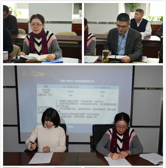 會上,相關業務部經理及各子公司負責人做了匯報和交流發言。為了使各業務部和子公司更好的完成年度目標任務,清晰目標任務的各項要求,會議安排了簡約的簽約儀式,全體業務部經理及子公司負責人與公司鄭重的簽訂了2017年經營目標任務書。