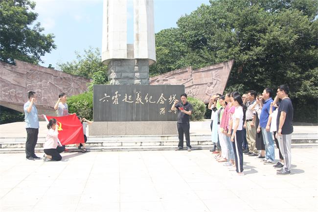 參觀完革命舊址群,頂著烈日和30多度的高溫,攀登144級臺階,大家來到了鄧小平親筆題寫的六霍起義紀念塔,在支部宣傳委員兼紀檢委員、副總經理陳建軍帶領下,大家面對黨旗和紀念塔進行了莊嚴的宣誓活動。