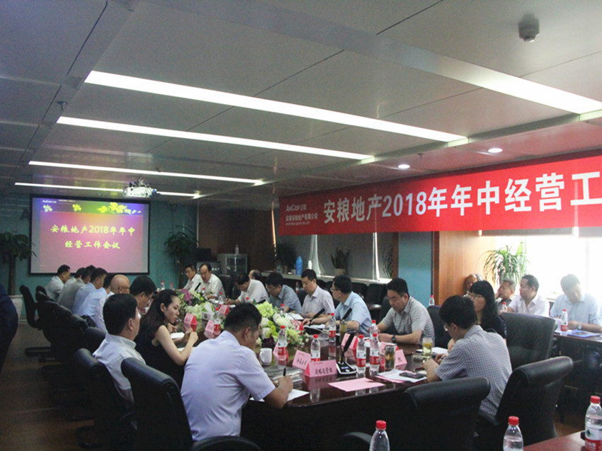 2018年7月23日上午,安糧地產在盛安廣場9樓1號會議室召開2018年年中經營工作會議。安糧集團(控股)領導方宗友、曹訓立、儲潔印、潘冬生,安糧地產領導班子、各項目負責人及各項目財務、工程、營銷條線負責人共49人參加了會議。會議由公司副總經理程海林主持。