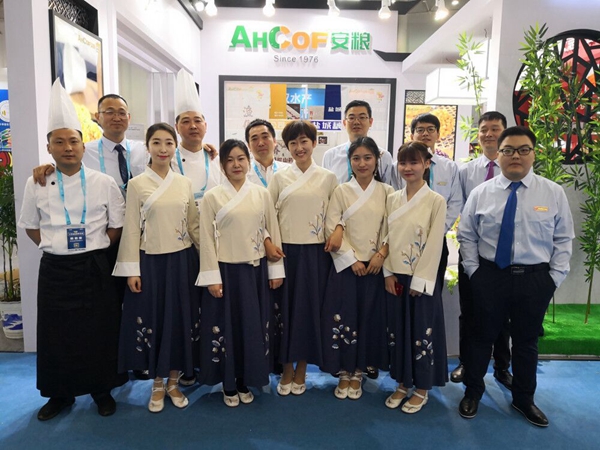 展會上,安糧實業的展臺延續去年頗受好評的徽派風格,獨具一格的展位設計,身穿漢服的安糧姑娘“紅唇粉肌,青衣羅衫”穿梭在徽派建筑之間,讓人眼前一亮。