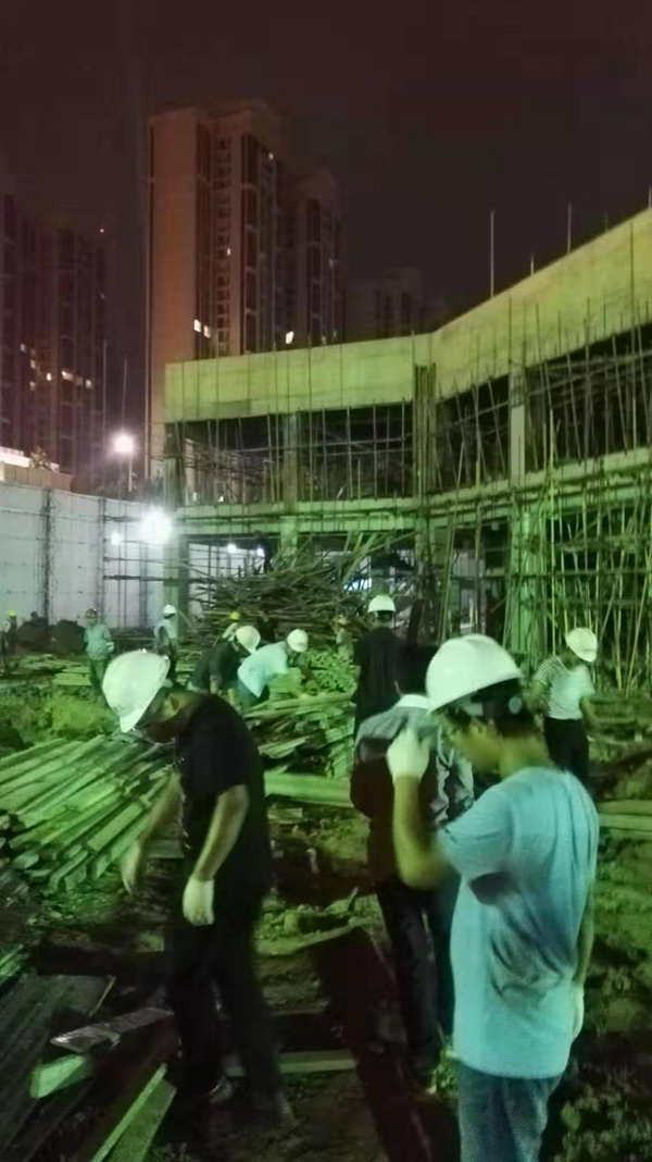經過簡短的會議部署,項目部管理人員即刻動員組織農民工加班,楊勇親自和工人們面對面溝通,對工人們曉之以理動之以情。不到11點半,工地現場的工作燈通通亮了起來,鋼筋班組、木工班組、管理人員紛紛投入工作,形成了一組初秋深夜的奏鳴曲。所有管理人員也都在現場陪著工人們一起干,不完成任務誰都不休息。