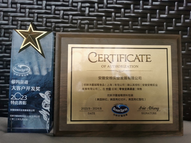 安糧實業獲得優鮮沛品牌授權,并榮獲“大客戶開發獎”,不僅是對安糧實業在休閑食品原料領域專業性的認可,也是對我司市場開拓能力的信任。通過共享資源、互換優勢,安糧實業與優鮮沛將共同推動休閑食品行業的發展,為廣大消費者帶來更多美味、健康的休閑食品,未來安糧實業與優鮮沛的合作會讓更多客戶采購到高品質休閑食品原料和新鮮蔓越莓產品。