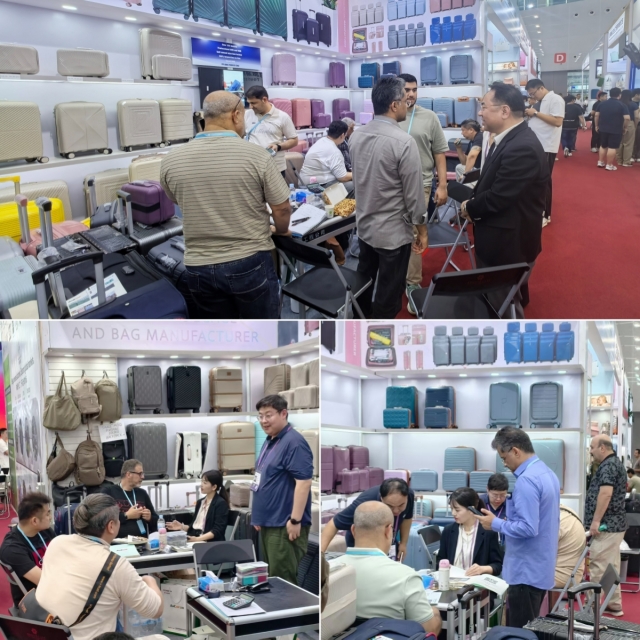 在箱包展區,為精準匹配全球不同市場消費需求,箱包團隊精心籌備70余款樣品,涵蓋新款外觀PP箱、鋁框前開PC箱、大容量軟包等多材質、全尺寸產品,更推出雙面前開PP箱、可壓縮雙肩背包等潮流新品,全面覆蓋出行、收納等多元場景。多款樣品憑借“輕便抗摔、易于定制、辨識度高”的核心優勢,成為采購商關注焦點。開展首日,箱包展區便迎來“開門紅”,不僅斬獲歐洲、中東、南美等多區域客戶的現場簽單,同時與數十位全球采購商達成明確采購意向,展現出全球市場對安糧箱包產品的高度認可。