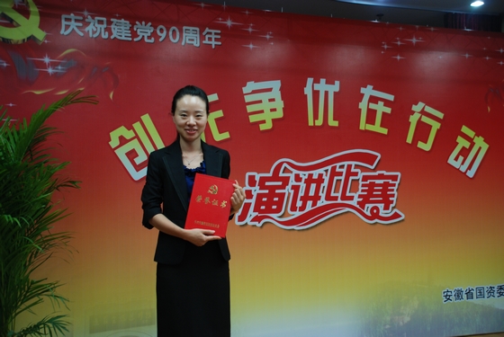 5月5日下午,為慶祝建黨90周年,安徽省國資委在三樓會議廳舉行省屬企業“創先爭優在行動”主題演講比賽活動。來自27家省屬企業的優秀選手同臺競技,安糧地產楊柳代表國貿集團參加了本次演講比賽,并以自信、從容和良好的語言表現力博得了臺下觀眾和評委的好評,獲得優秀獎。